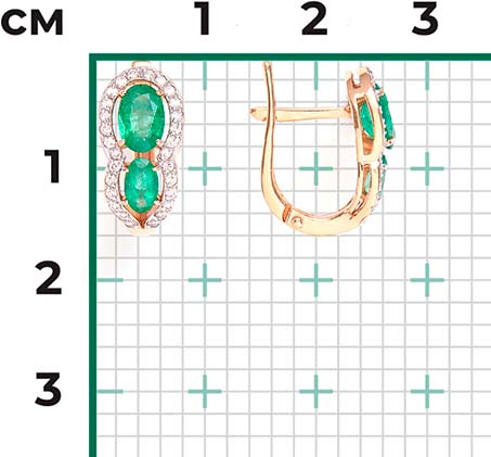 - изумруд - 2шт. - 0,78К, чистота камня 3/3 (цвет, качество), изумруд - 2шт. - 0,35К, чистота камня 3/3 (цвет, качество), бриллиант в 57 граней - 56шт. - 0,27К, чистота камня 4/4А (цвет, качество)