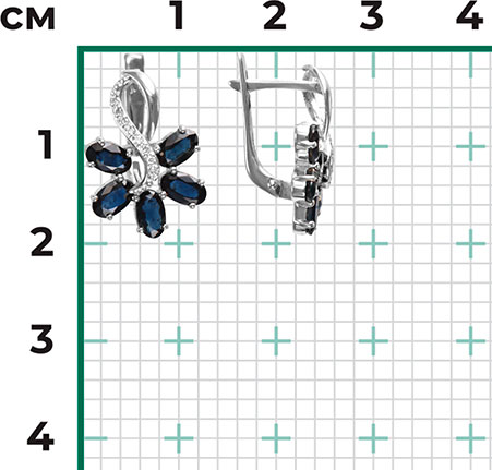 - сапфир облагороженный - 10шт. - 2,53К, чистота камня 3/2 (цвет, качество), бриллиант - 16шт. в 57 граней - 0,07К, чистота камня 4/5А (цвет, качество)