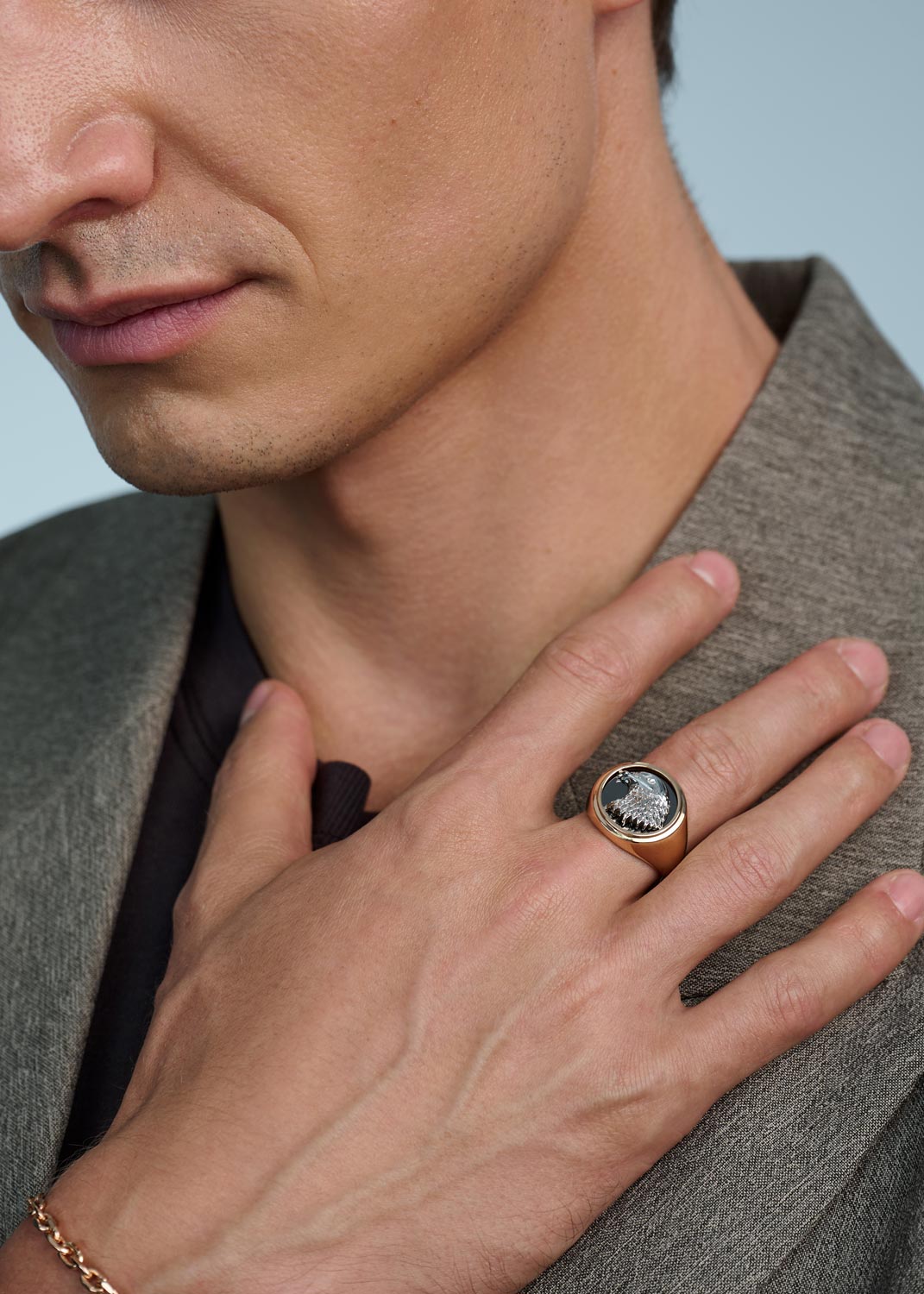 - желтое золото, сердолик, эмаль, бриллиант, вес: для размера 17 - 8,2г.