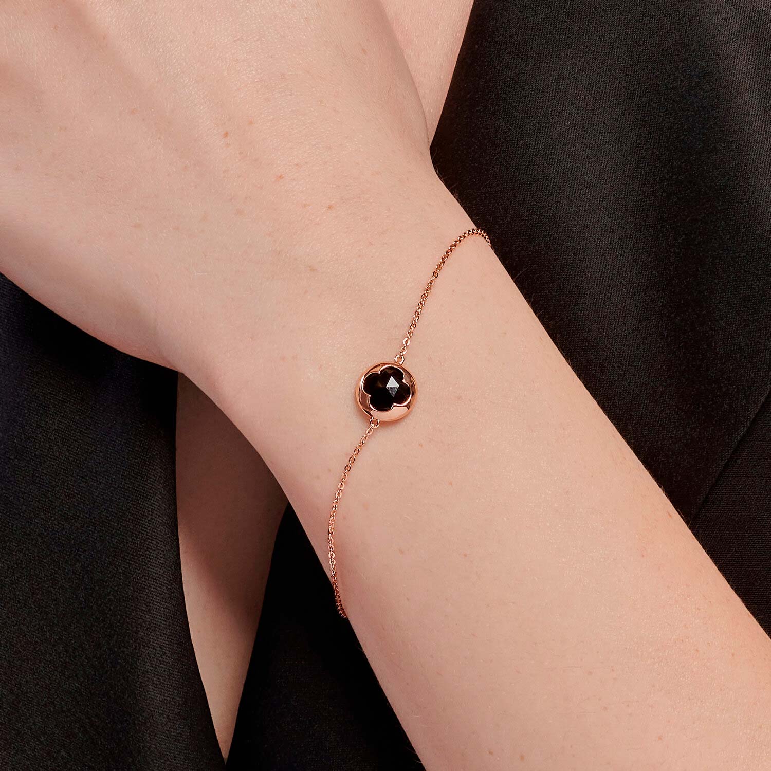 Интересный золотой браслет на тонкой цепочке якорного плетения с круглой вставкой, декорированной клевером из черного агата, станет для вас изящным украшением, приносящим удачу. Регулируемая длина. Застежка - кольцо.