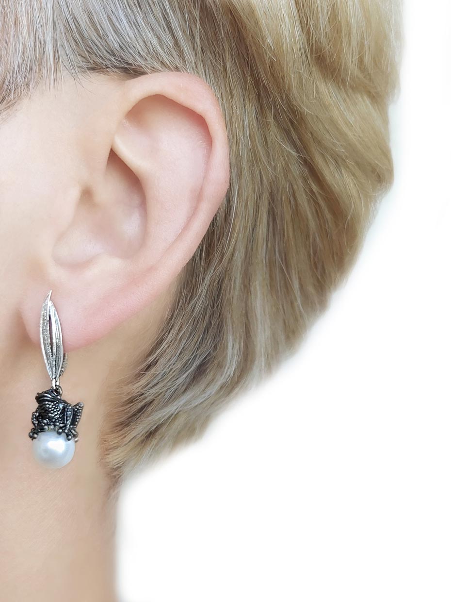 Фото «Серебряные серьги с подвесками ''Лягушки'' Spika Gold 20076-055-10 с жемчугом, гранатами»