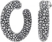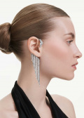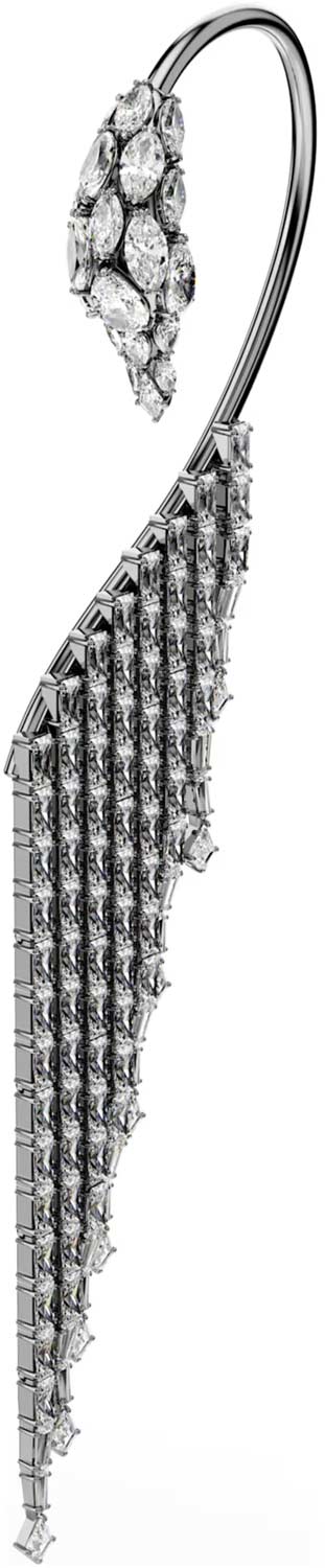 Серьги-каффы с каскадом подвесных элементов напоминают лебедя. Изделия украшены прозрачными кристаллами разной огранки и дополнены рутениевым покрытием.