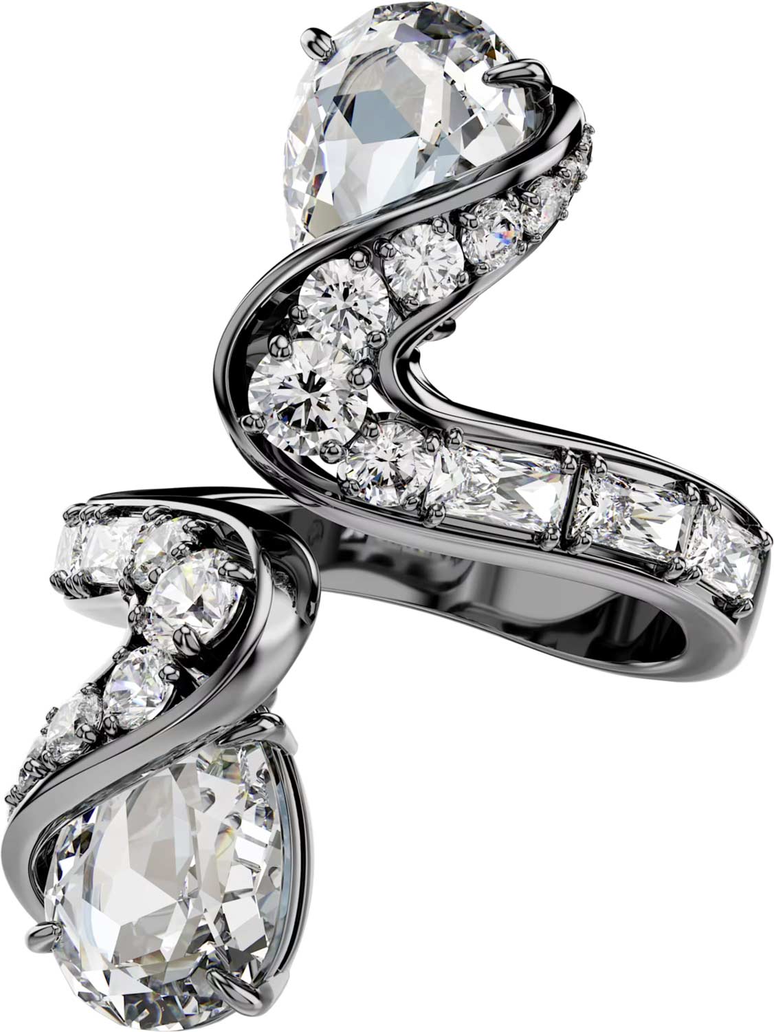 Открытое кольцо с прозрачными кристаллами разной огранки и рутениевым покрытием.