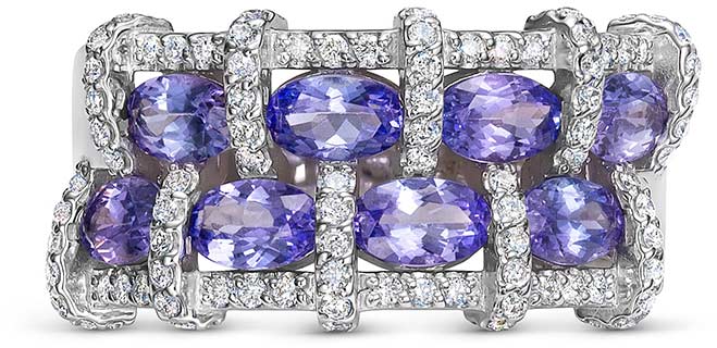 - танзанит - 2шт. - 0,459К, танзанит - 2шт. - 0,459К, танзанит - 2шт. - 0,458К, танзанит - 2шт. - 0,458К, бриллиант в 57 граней - 94шт. - 0,385К, чистота камня 3/6А (цвет, качество)