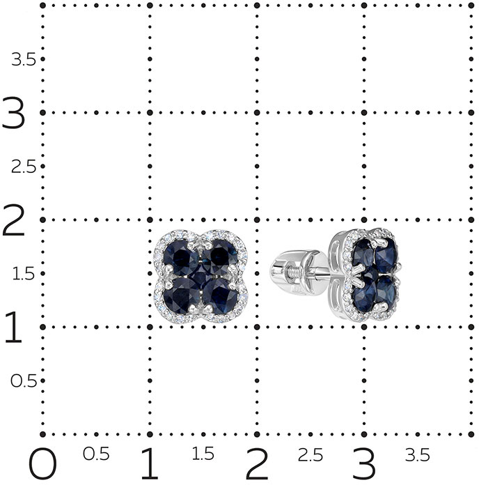 - сапфир - 8шт. - 1,040К, чистота камня 2/2 (цвет, качество), сапфир - 2шт. - 0,086К, чистота камня 2/2 (цвет, качество), бриллиант в 17 граней - 48шт. - 0,139К, чистота камня 2/2А (цвет, качество)(цвет, качество)