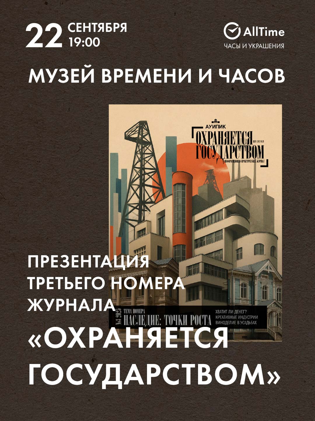 Музей Времени и Часов, «Агентство по управлению и использованию памятников истории и культуры» и Всероссийское общество охраны памятников истории и культуры приглашают 22 сентября (понедельник) в 19:00 на презентацию третьего номера журнала «Охраняется государством» за 2025 год. Тема выпуска -- «Наследие: точки роста».