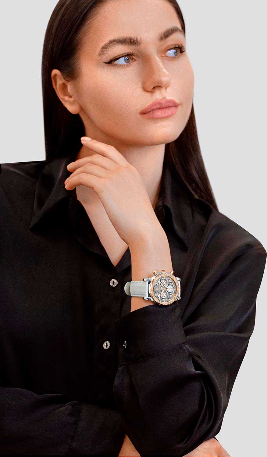 Женские часы придерживаются тех же правил, но по желанию могут быть украшены сиянием драгоценных камней или мягким блеском кристаллов.