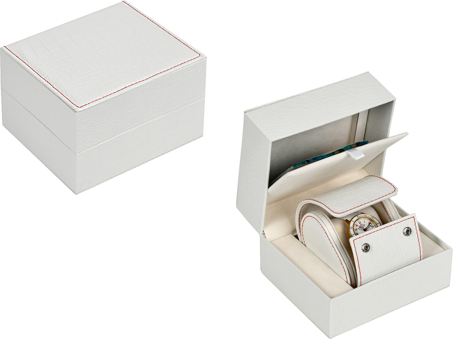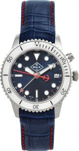 Вращающийся безель. Задняя крышка украшена лазерной гравировкой. Ремешок с красной строчкой и классической застежкой. В комплекте дорожный футляр и платок из натурального шелка с индивидуальным дизайном.