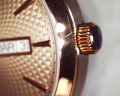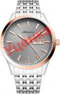 Наручные часы с круглым стальном корпусе. Гильошированный циферблат с метками в виде штрихов. Окошко даты и дня недели находится в положении 3 часа. Рифленая заводная головка. Браслет с раскладывающейся застежкой.