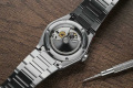 Метки в виде штрихов. Метки и стрелки с люминесцентным покрытием Superluminova, которое светится в темноте после непродолжительной зарядки на свету. Окошко даты находится в положении 3 часа. Завинчивающаяся заводная головка. Прозрачная задняя крышка. Браслет с раскладывающейся застежкой.