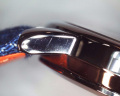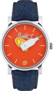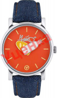 Ремешок из синей джинсовой ткани, комбинированной с оранжевой кожей с логотипом «Чайф» на внутренней стороне. Классическая застежка. В комплекте дополнительный ремешок из яркого оранжевого полиэстера.