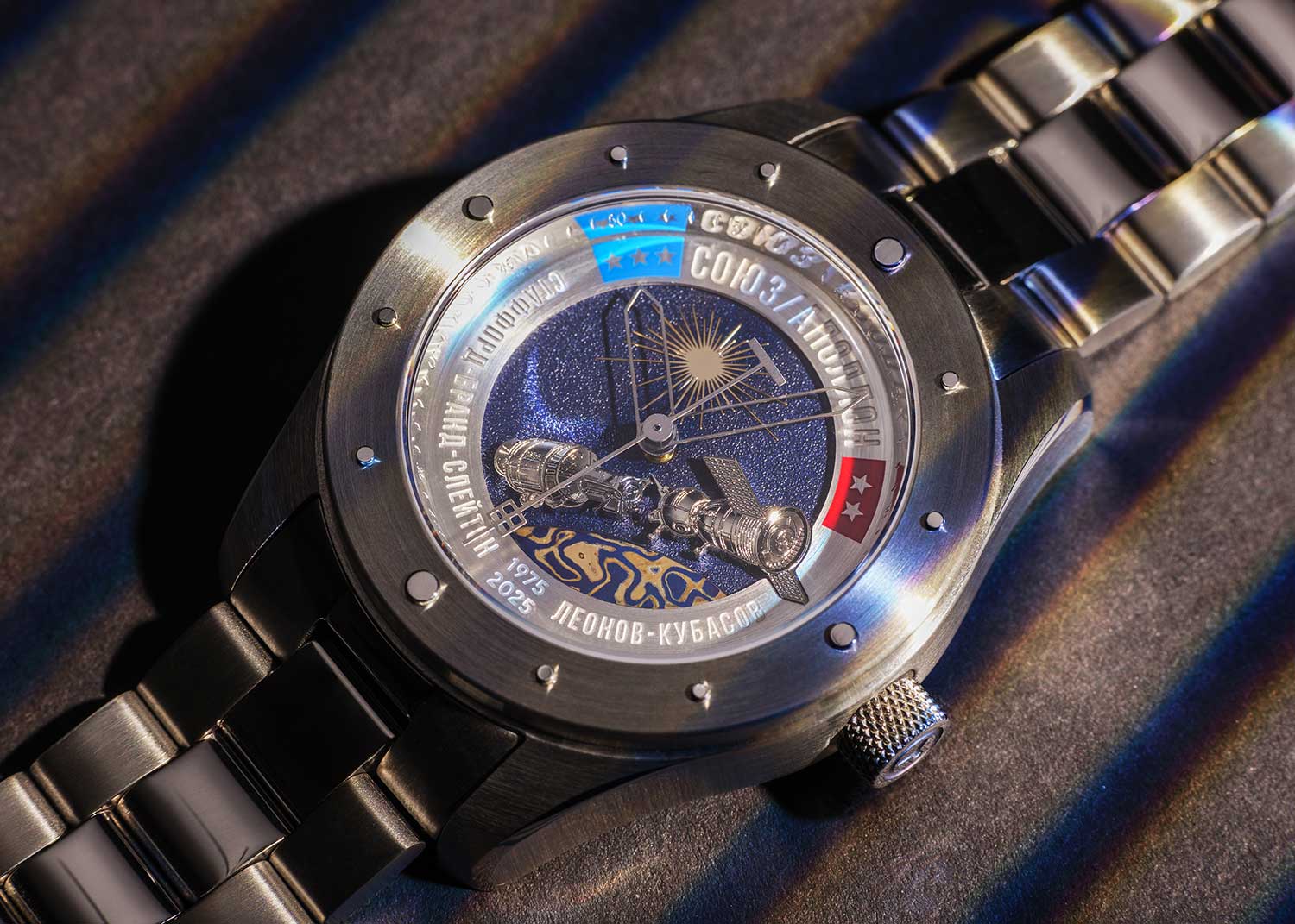 Циферблат украшен космическими кораблями и дополнен элементом, который символизирует Землю. Элемент изготовлен из мокаме-гане — это композит из разных по своим декоративным характеристикам металлов (титана и золота), выполненный по японской кузнечной методике XVII века, имитирующей дамаск.