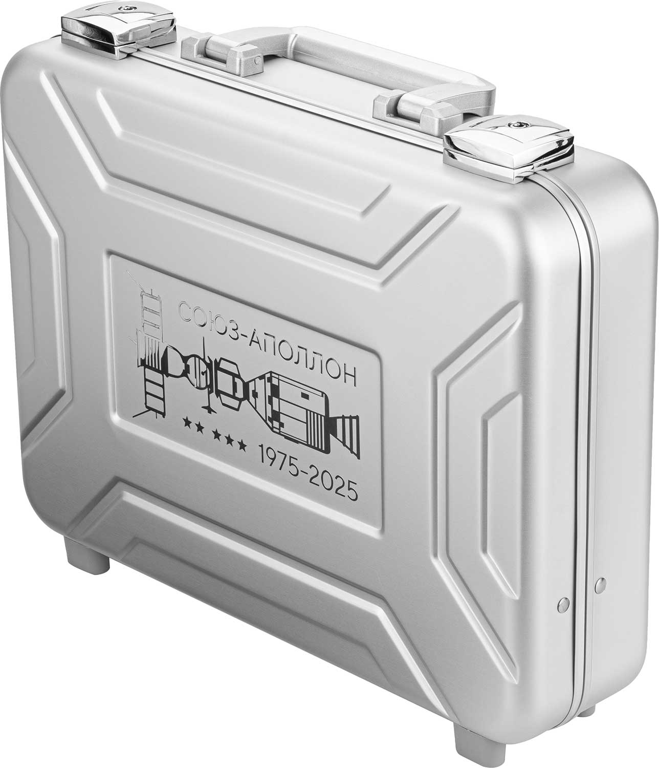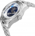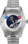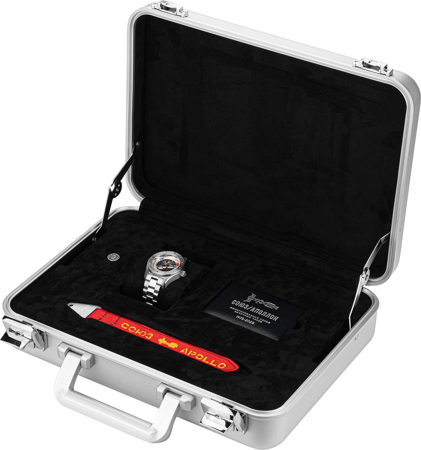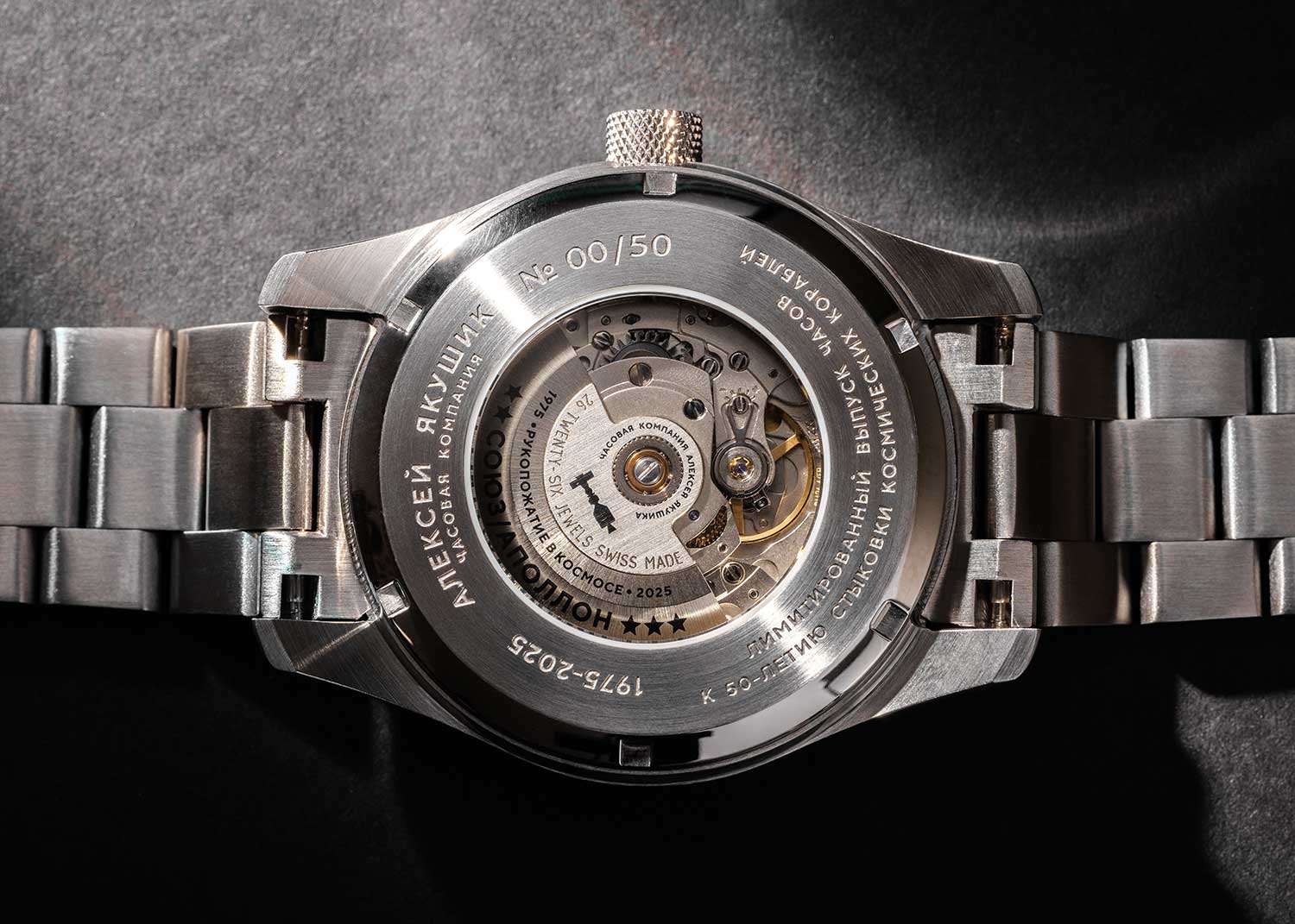 В механизме 26 камней, частота 28800 полуколебаний в час. Запас хода 41 час. Прозрачная задняя крышка. Браслет с раскладывающейся застежкой. В комплекте подарочный алюминиевый кейс и точная копия контрольного флажка космического корабля «Союз-19».