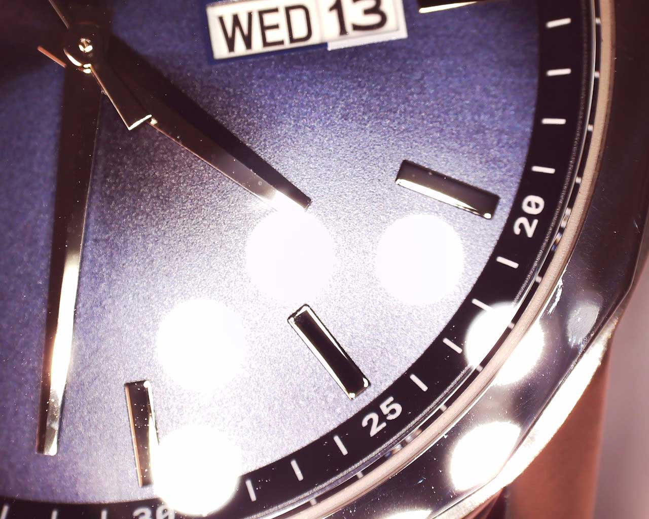 Мужские кварцевые часы. Круглый стальной корпус. Циферблат выполнен по технологии Sunray (солнечные лучи). Метки в виде штрихов. Окошко даты и дня недели находится в положении 3 часа. Заводная головка с защитой. Завинчивающаяся задняя крышка. Стальной браслет с раскладывающейся застежкой.