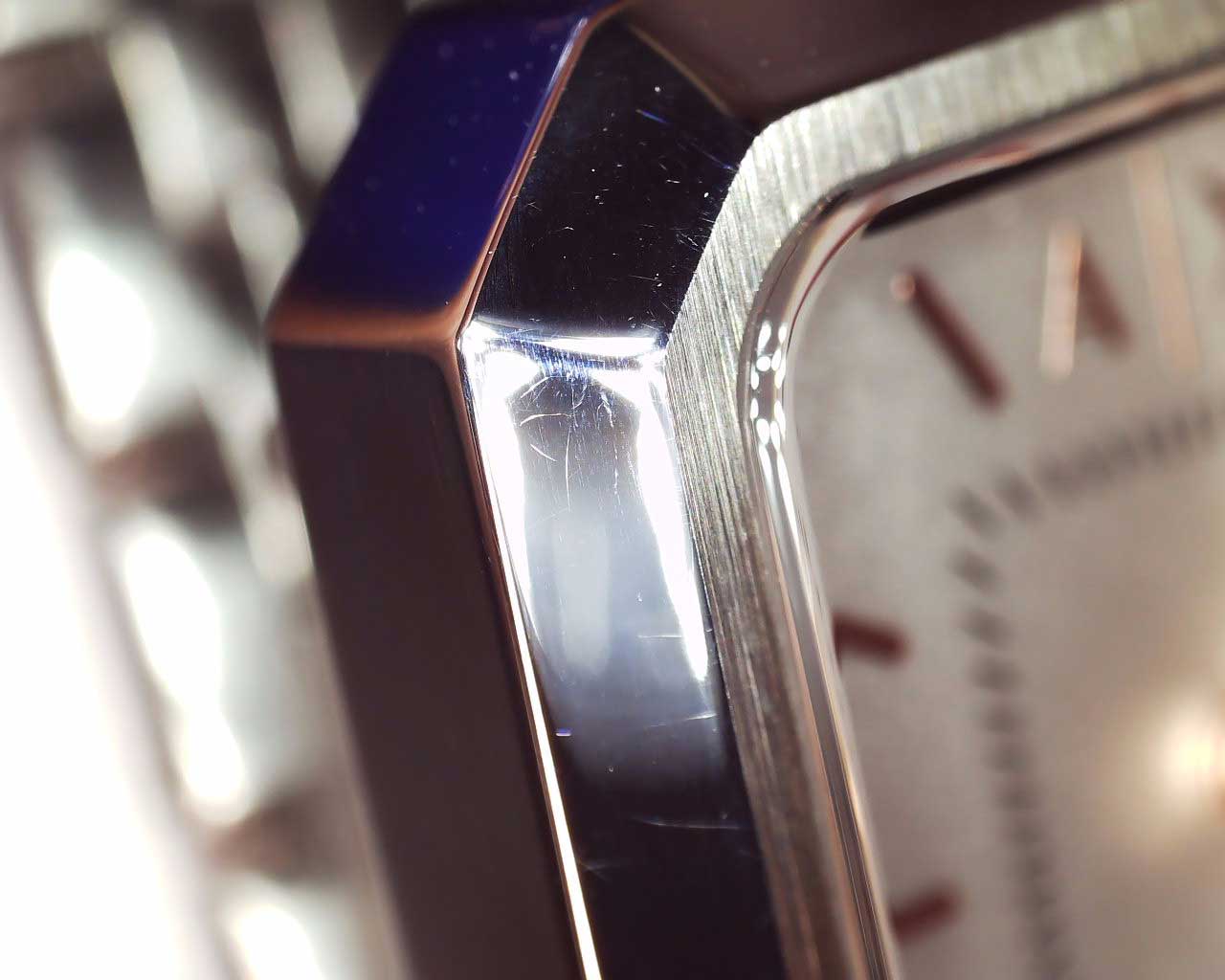 Женские кварцевые часы. Квадратный стальной корпус. Циферблат выполнен по технологии Sunray (солнечные лучи) и украшен накладным логотипом бренда. Метки в виде штрихов. Граненая заводная головка. Стальной браслет с раскладывающейся застежкой.