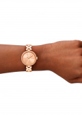 Накладные метки в виде штрихов. Заостренные прямоугольные стрелки в стиле Baton. Гладкая заводная головка. Узкий стальной браслет с раскладывающейся застежкой.