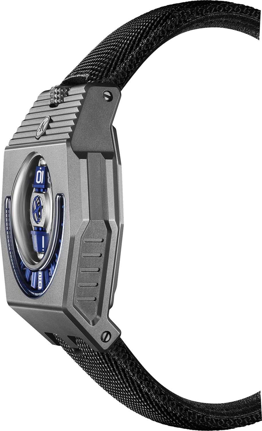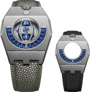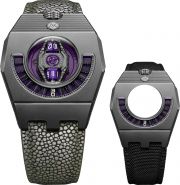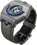 Заводная головка с защитой находится в положении 12 часов. Задняя крышка с прозрачным окошком крепится на 4-х винтах. Ремешок из кожи ската с классической застежкой. В комплекте сменный ремешок.