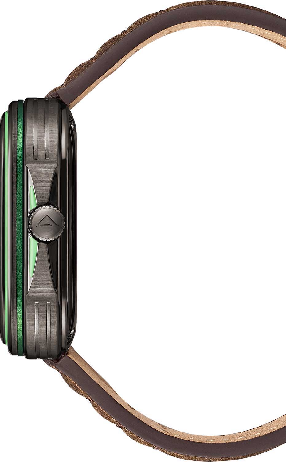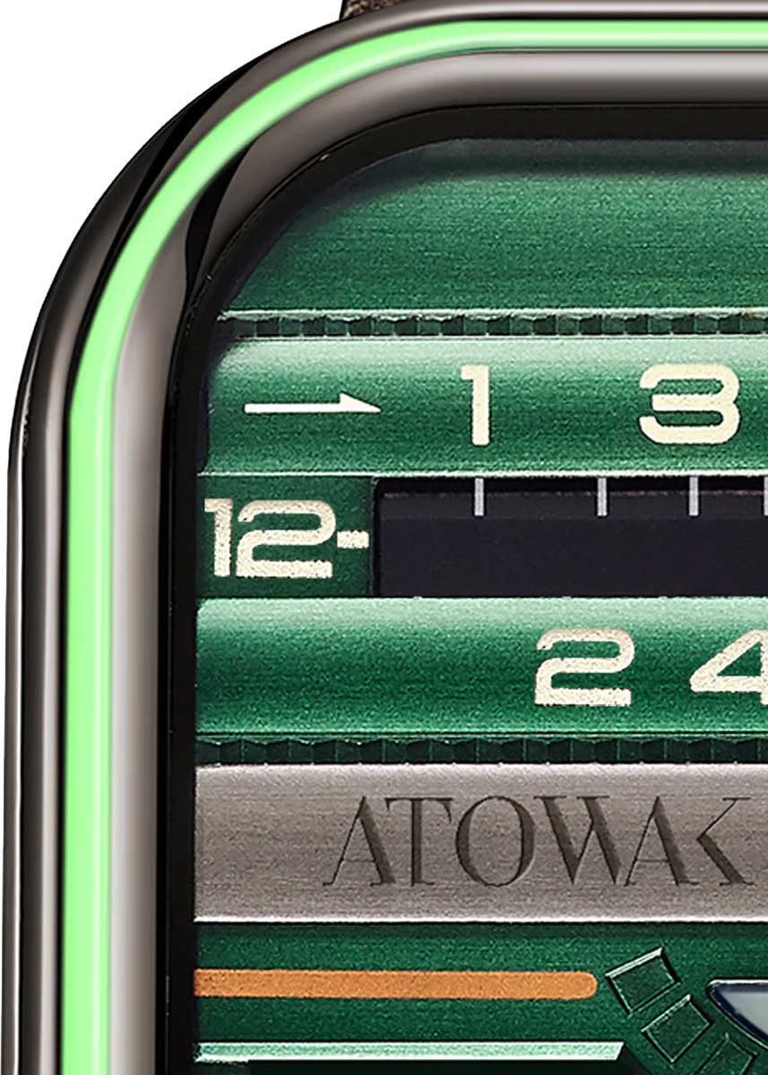 7-ми слойный циферблат защищен прочным сапфировым стеклом. Стрелки, метки и частично корпус с люминесцентным