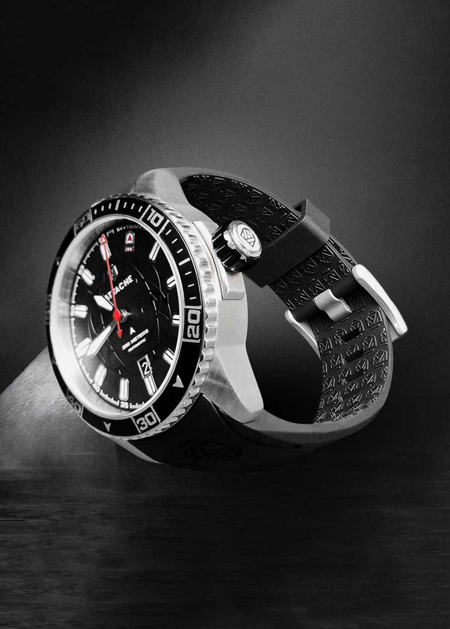 Окошко даты находится в положении 6 часов. Люминесцентное покрытие Super-LumiNova, которое светится в темноте после непродолжительной зарядки на свету. Завинчивающаяся рифленая заводная головка. Завинчивающаяся задняя крышка со стилизованной картой трафика воздушных путей. Удобный кожаный ремешок. В комплекте силиконовый ремешок с классической застежкой.