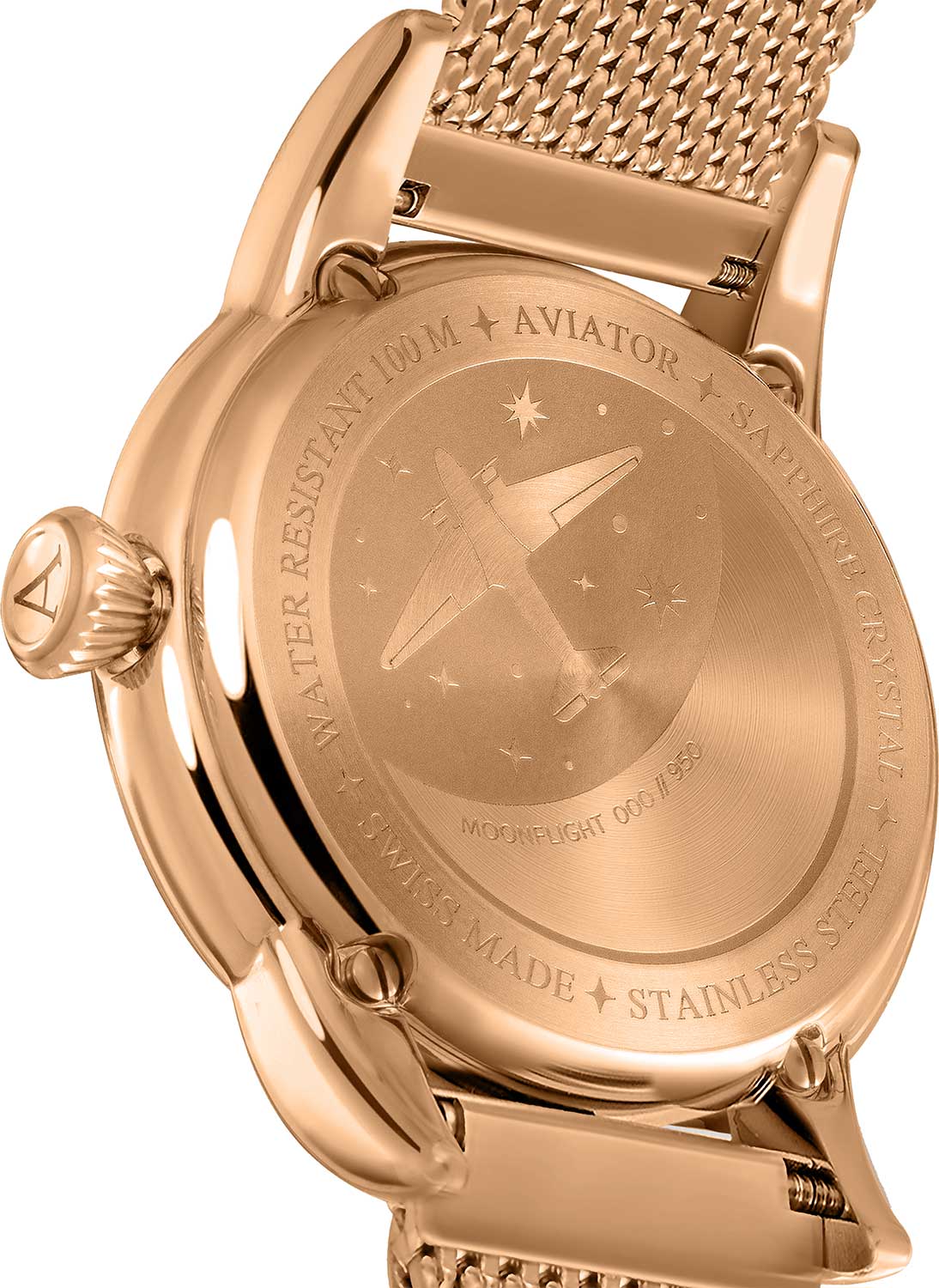 Рифленая заводная головка с двойной прокладкой. Задняя крышка украшена гравировкой. Браслет миланского плетения с раскладывающейся застежкой.