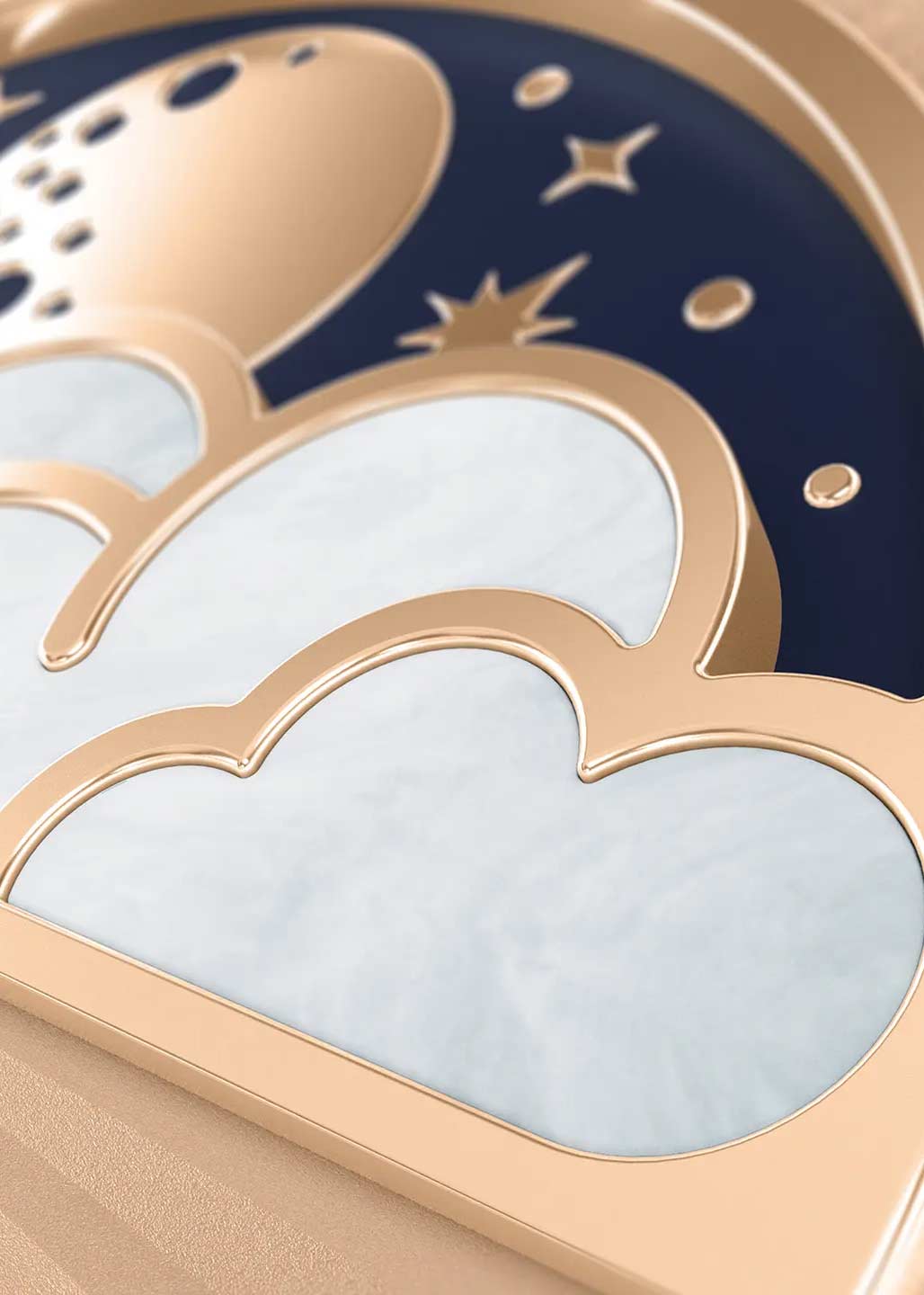 Метки в виде точек. Окошко даты находится в положении 6 часов. Облака на циферблате украшены перламутровыми вставками. Антибликовое покрытие на сапфировом стекле позволяет с легкостью узнать время даже при ярком солнце.