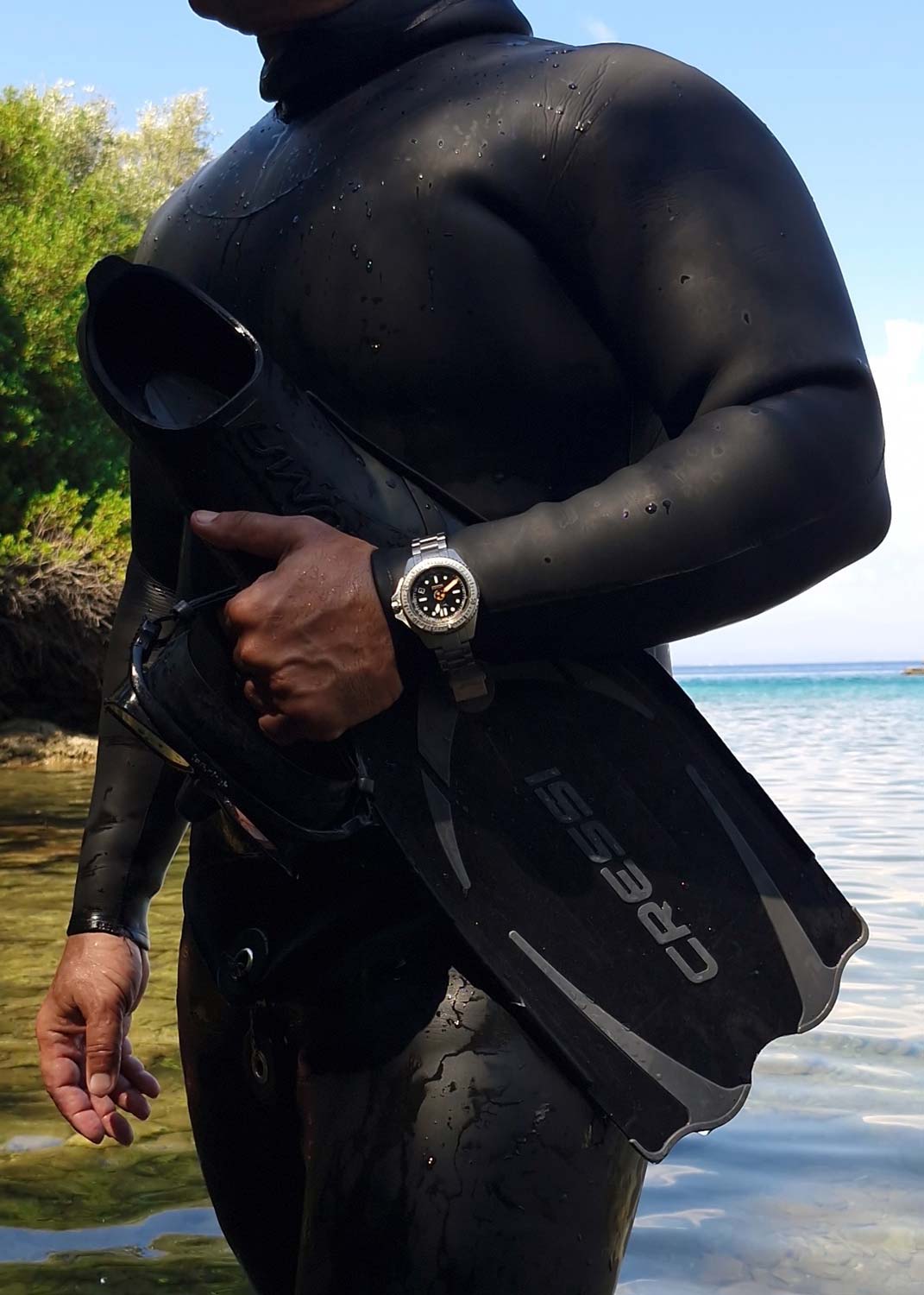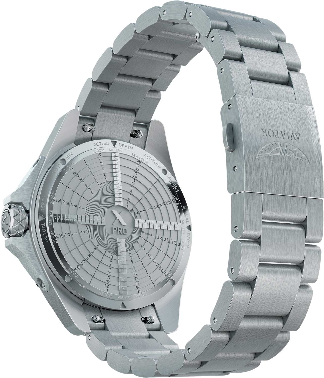 На заднюю крышку корпуса нанесена шкала. Благодаря тонкой отделке она хорошо видна и проста в использовании. На крышке приводится таблица бездекомпрессионного предела при погружении в воду на высоте – она призвана помочь дайверам рассчитать безопасное время всплытия в высокогорных озерах. Стальной браслет с раскладывающейся застежкой. Застежка с системой блокировки.