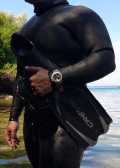 Эмалевый циферблат с метками в виде точек и штрихов. На внутреннем кольце циферблата шкала бездекомпрессионного предела, что обеспечивает повышенную безопасность и точность. Окошко даты в положении 4 часа.