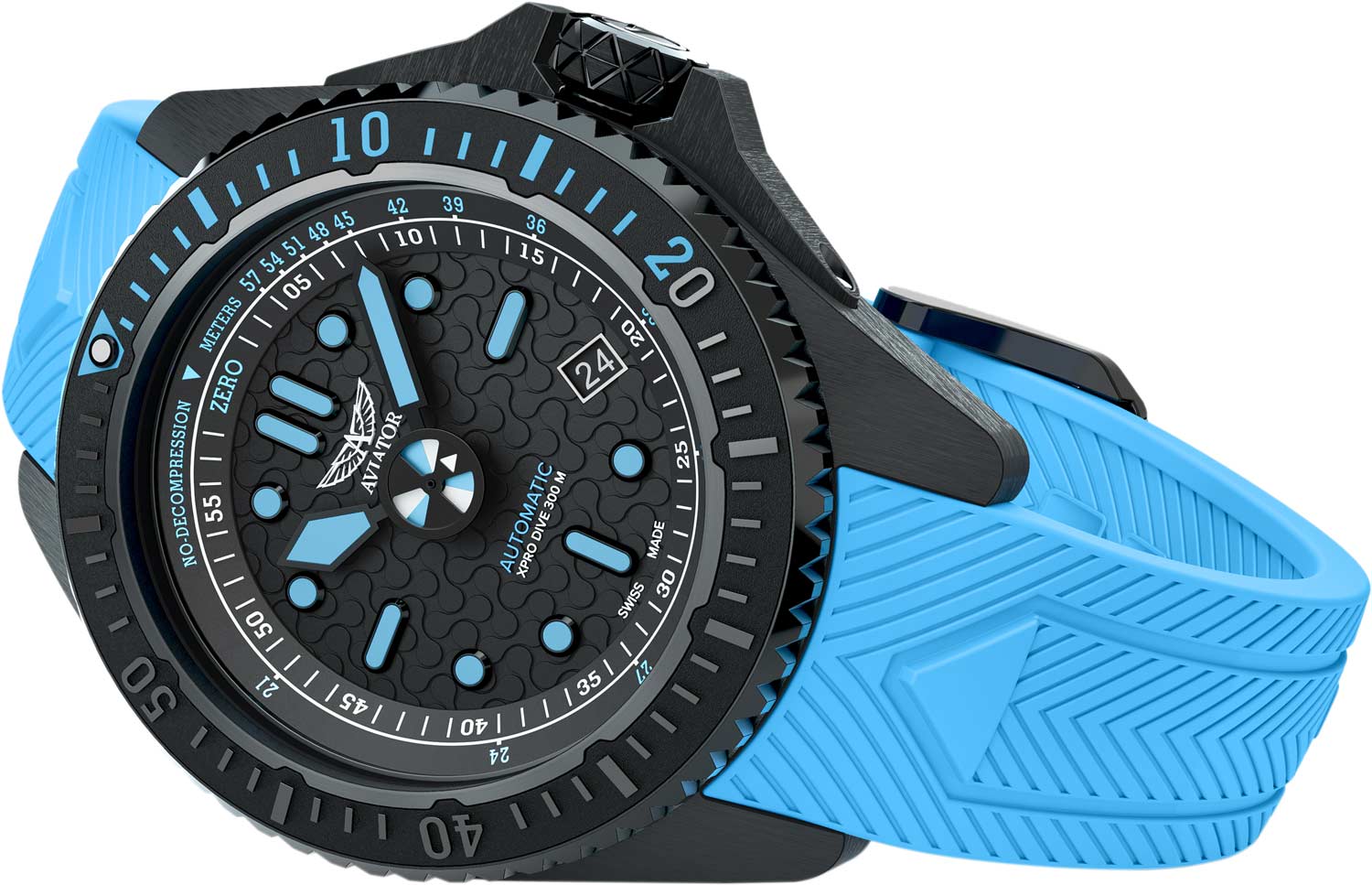 Циферблат с глубоким матовым покрытием и текстурой. Метки в виде точек и штрихов. На внутреннем кольце циферблата шкала бездекомпрессионного предела, что обеспечивает повышенную безопасность и точность. Окошко даты в положении 4 часа.