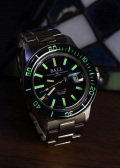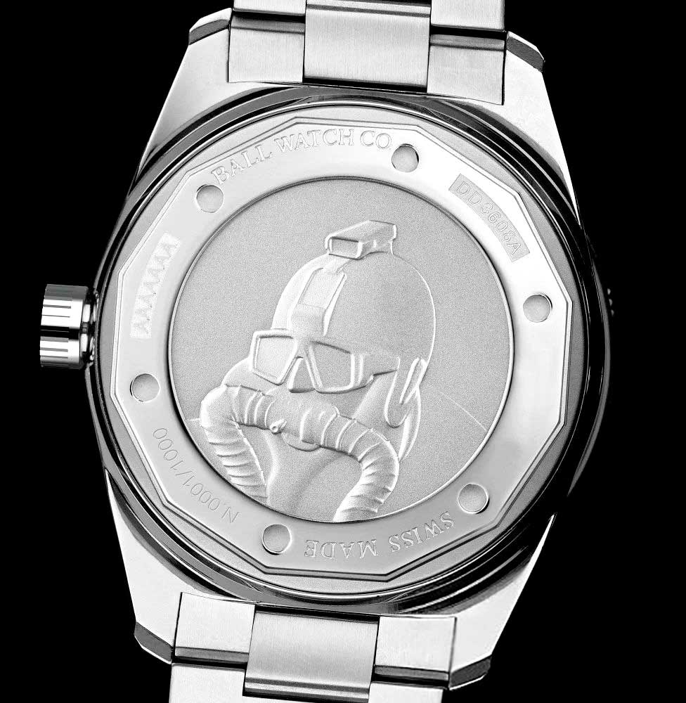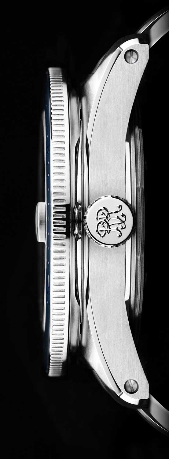 Окошко даты с увеличительным стеклом находится в положении 3 часа. Завинчивающаяся рифленая заводная головка. Восьмиугольная задняя крышка украшена гравировкой с изображением дайвера в защитном шлеме и очках, с дыхательной трубкой. Стальной браслет с раскладывающейся застежкой.