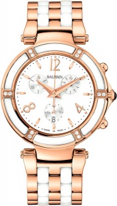 Манящий блеск керамики с чередой роскошных бриллиантов станет стильным оружием в искусстве обольщения. Balceram Chrono. Стиль, элегантность и многофункциональность - три столпа совершенства, которые характеризуют женские часы-хронограф с секундомером от Balmain. Корпус привлечет вас сиянием 12 бриллиантов и блеском керамических вставок. Сапфировое стекло - незаменимый атрибут престижных швейцарских часов, надежно защитит их от царапин. Заводная головка украшена камнем в форме кабошона, что придает часам дополнительные шарм и изюминку.
