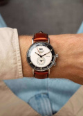 Заостренные прямоугольные стрелки в стиле Baton. Метки и стрелки с люминесцентным покрытием, которое светится в темноте после непродолжительной зарядки на свету. Рифленая заводная головка. Удобный кожаный ремешок.