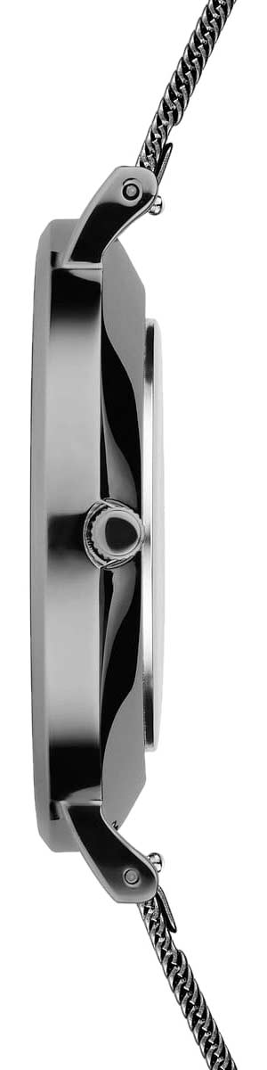 Секундная стрелка вынесена на отдельный циферблат. Рифленая заводная головка. Стальной браслет миланского плетения. Застежка с фиксатором.
