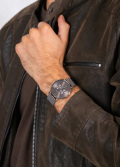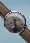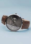 Дата и день недели вынесены на отдельные циферблаты. Рифленая заводная головка. Стальной браслет миланского плетения. Застежка с фиксатором. В комплекте коричневый кожаный ремешок.