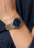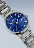 Рифленая заводная головка. Завинчивающаяся задняя крышка. Титановый браслет с раскладывающейся застежкой. В комплект входит одно дополнительное звено.
