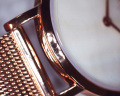 Женские наручные часы. Круглый стальной корпус с полированной поверхностью. Перламутровый циферблат без меток защищен прочным сапфировым стеклом. Рифленая заводная головка. Стальной браслет миланского плетения. Застежка с фиксатором.