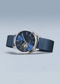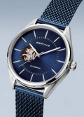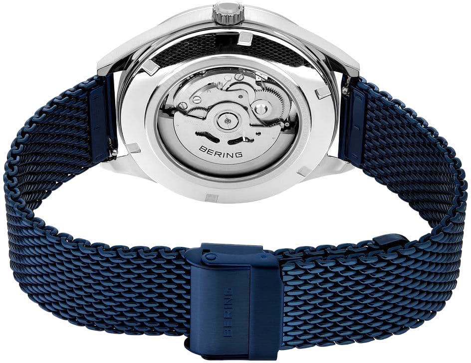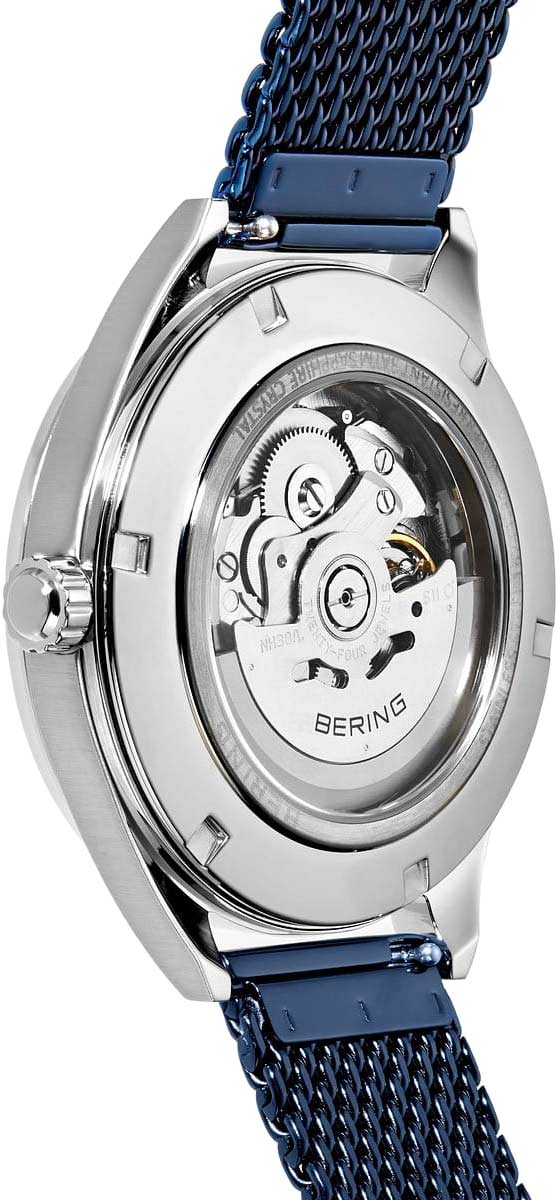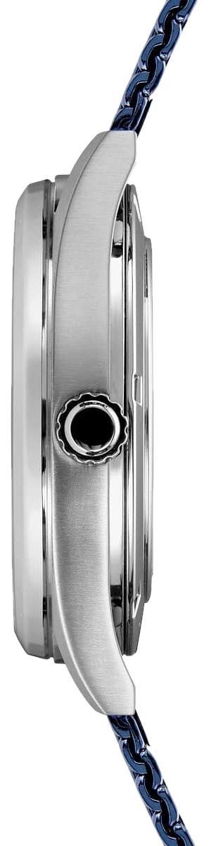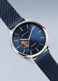 Сквозь прозрачное окошко на циферблате можно наблюдать за работой механизма часов. Рифленая заводная головка. Завинчивающаяся прозрачная задняя крышка. Стальной браслет миланского плетения. Застежка с фиксатором.