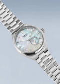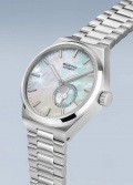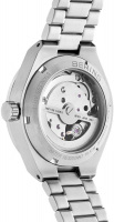 Рифленая заводная головка. Завинчивающаяся прозрачная задняя крышка. Стальной браслет с раскладывающейся застежкой.