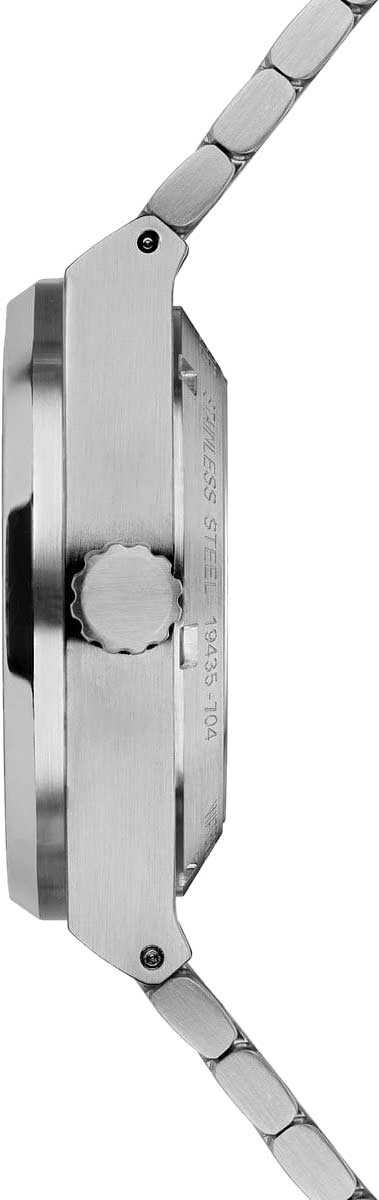 Рифленая заводная головка. Завинчивающаяся прозрачная задняя крышка. Стальной браслет с раскладывающейся застежкой.