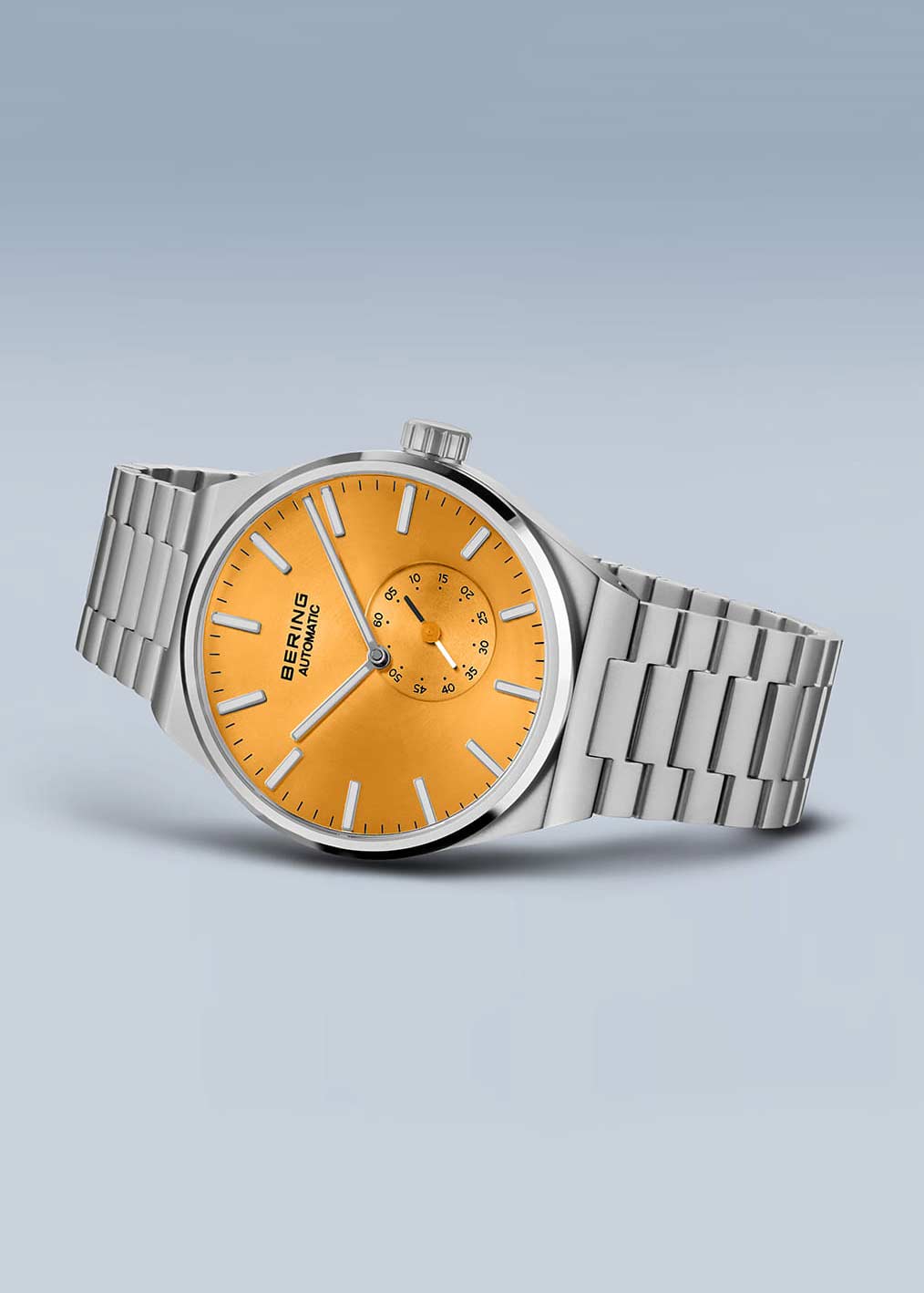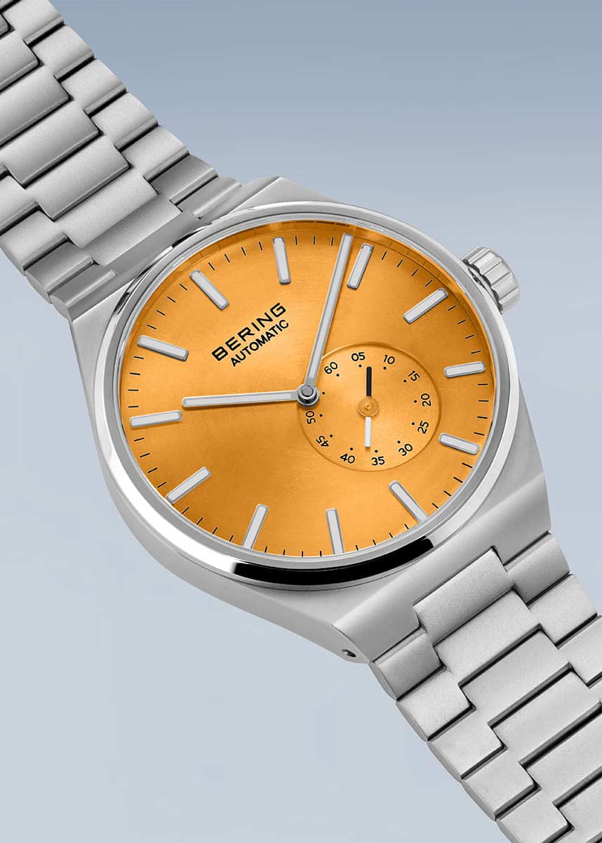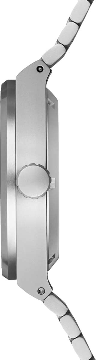 Секундная стрелка вынесена на отдельный циферблат. Рифленая заводная головка. Завинчивающаяся прозрачная задняя крышка. Стальной браслет с раскладывающейся застежкой.