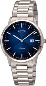 Royce. Мужские наручные часы. Круглый корпус из титана. Циферблат с метками в виде штрихов выполнен по технологии Sunray (солнечные лучи). Окошко даты находится в положении 3 часа. Браслет с раскладывающейся застежкой.