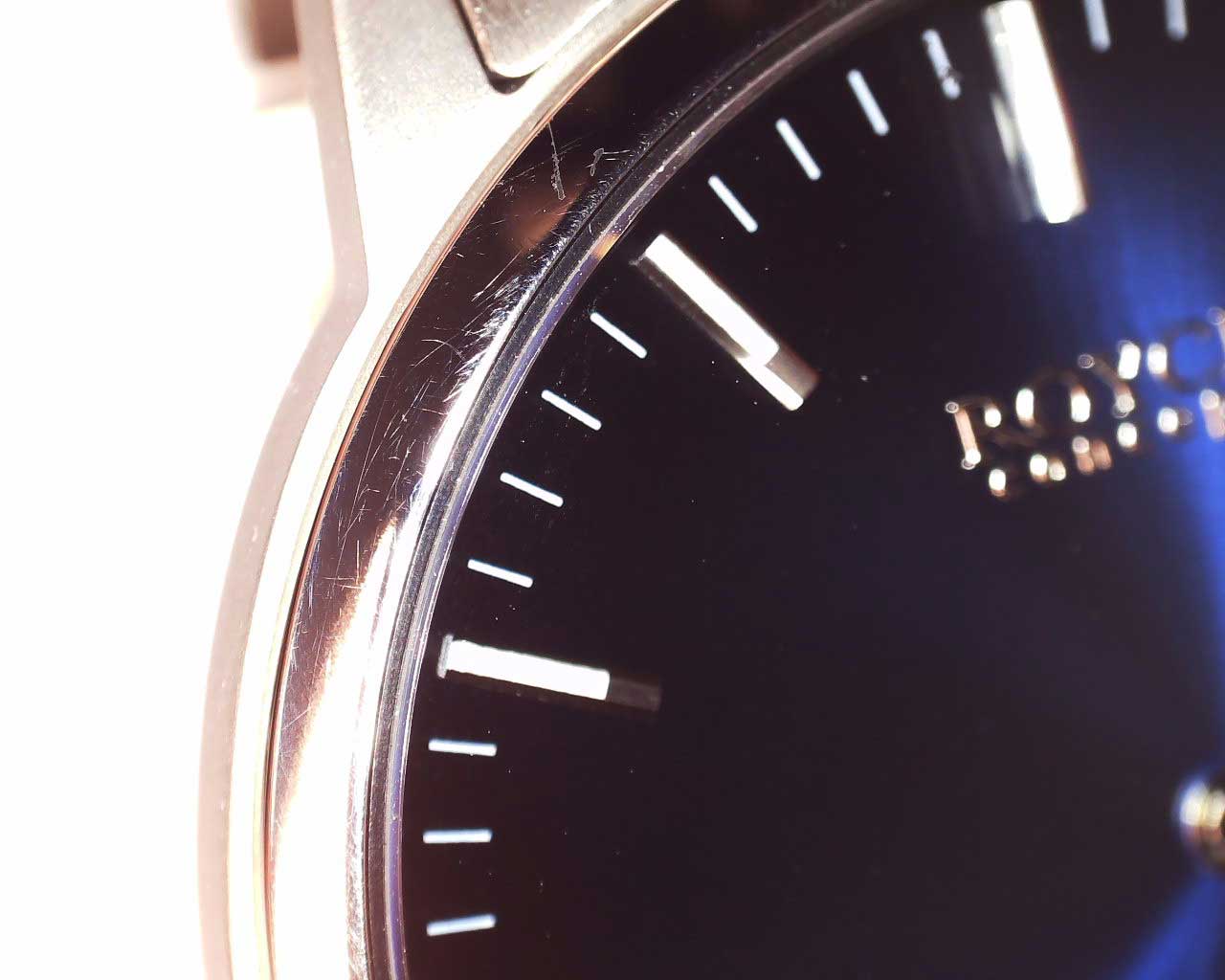 Royce. Мужские наручные часы. Круглый корпус из титана. Циферблат с метками в виде штрихов выполнен по технологии Sunray (солнечные лучи). Окошко даты находится в положении 3 часа. Браслет с раскладывающейся застежкой.