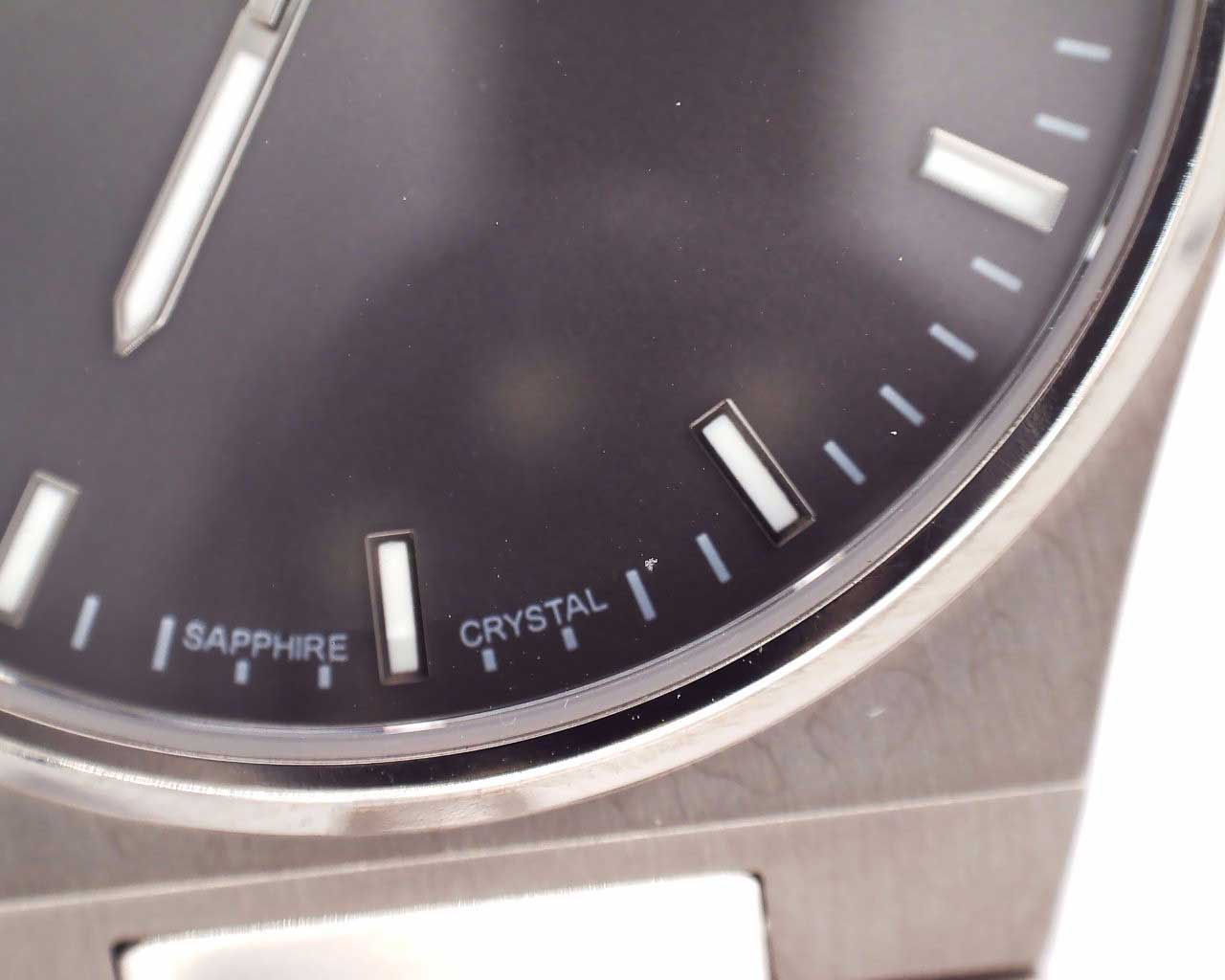 Мужские часы с круглым титановым корпусом. Циферблат с метками в виде штрихов и арабской цифры 12. Окошко даты. Браслет с раскладывающейся застежкой.