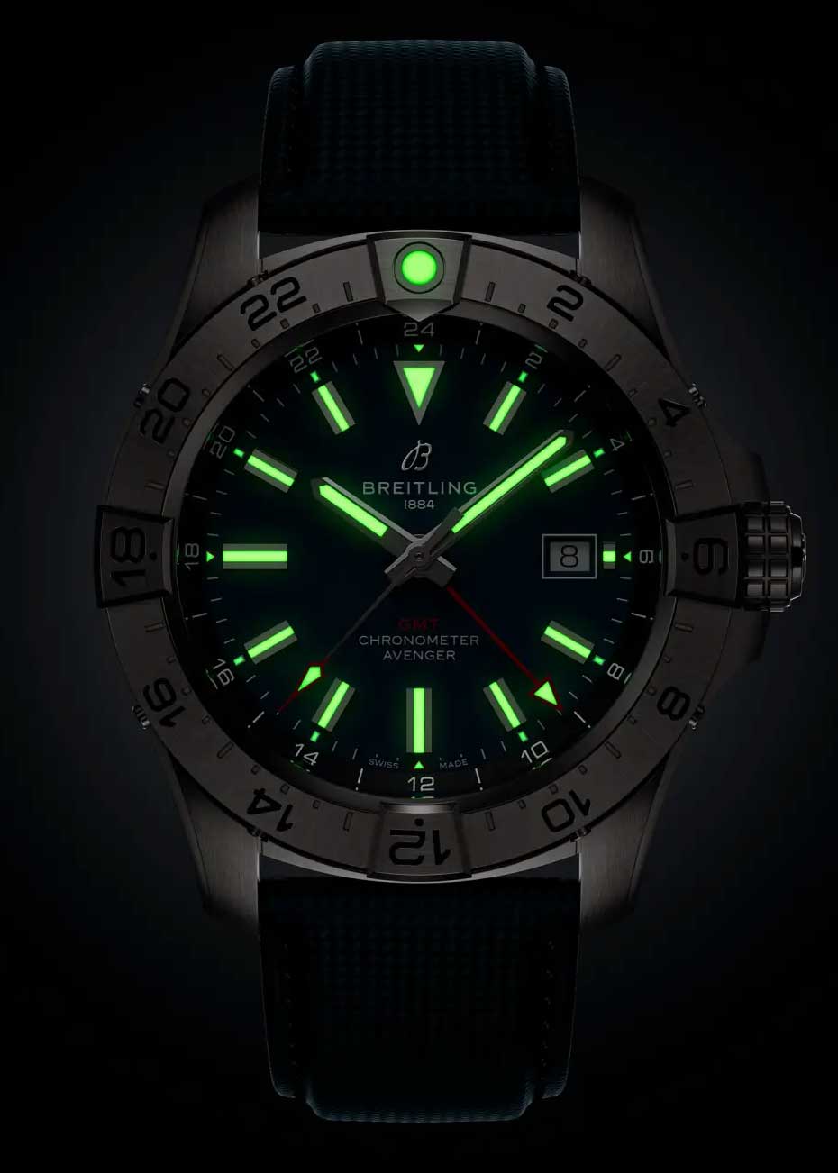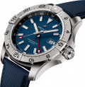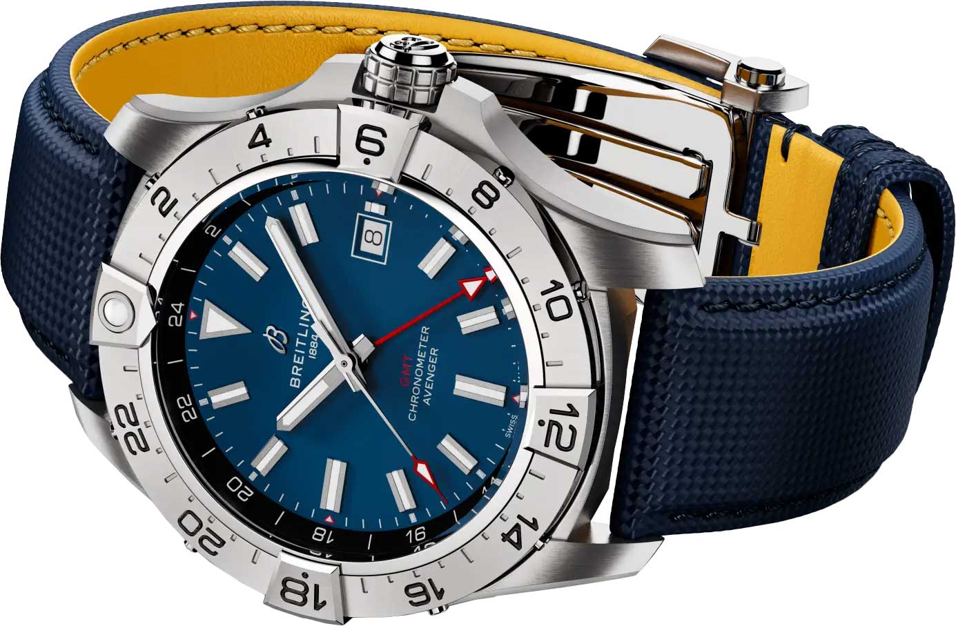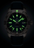Вращающийся безель с 24-часовой шкалой позволяет отслеживать три часовых пояса одновременно. Завинчивающаяся заводная головка с защитой и двойной прокладкой. Завинчивающаяся задняя крышка. Ремешок с раскладывающейся застежкой.