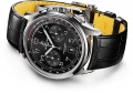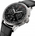Часы-хронограф с секундомером и тахиметром. Секундомер с точностью 1/4с и временем измерения 30мин отображается центральной стрелкой. Секундная стрелка вынесена на отдельный циферблат.