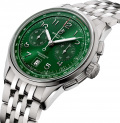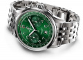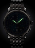 Часы-хронограф с секундомером и тахиметром. Секундомер с точностью 1/4с и временем измерения 30мин отображается центральной стрелкой. Секундная стрелка вынесена на отдельный циферблат.