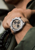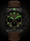 Часы-хронограф с секундомером. Секундомер с точностью 1/4с и временем измерения 12ч отображается центральной стрелкой. Секундная стрелка вынесена на отдельный циферблат.