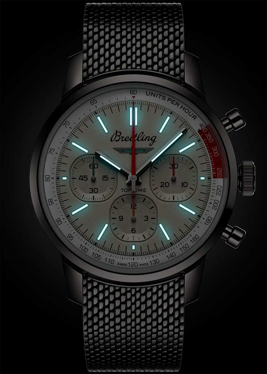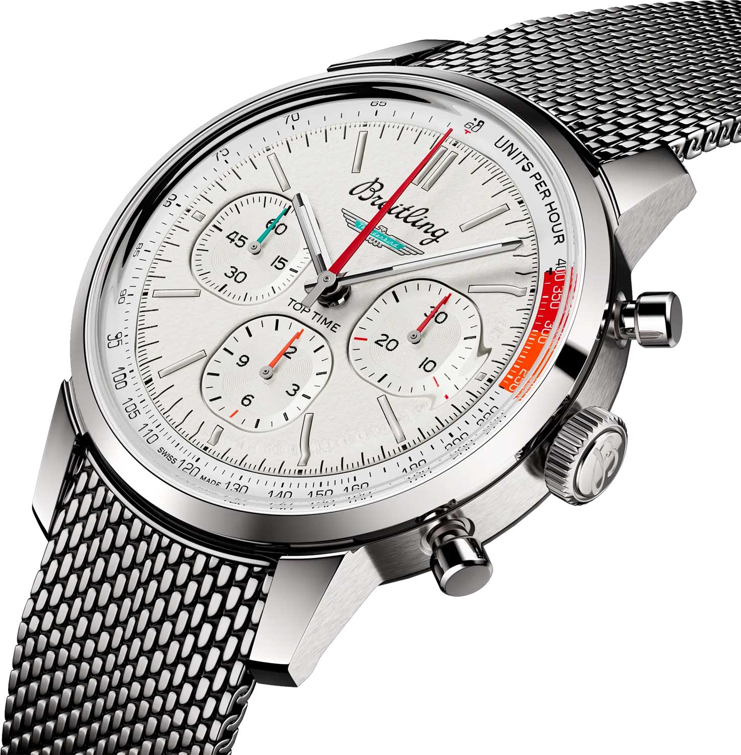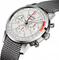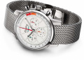 Часы-хронограф с секундомером и тахиметром. Секундомер с точностью 1/4с и временем измерения 12ч отображается центральной стрелкой. Секундная стрелка вынесена на отдельный циферблат.