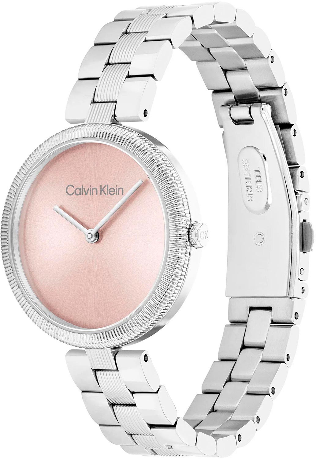 Заводная головка украшена логотипом ''CK''. Стальной браслет с раскладывающейся застежкой, украшенной логотипом бренда CK.