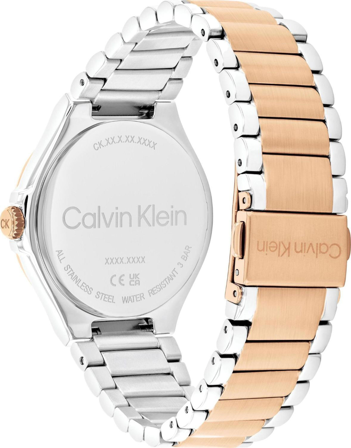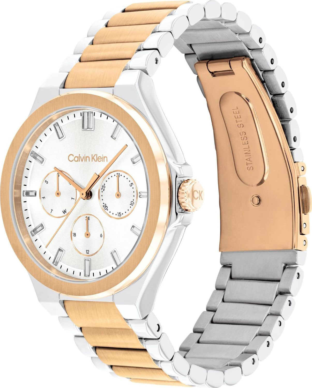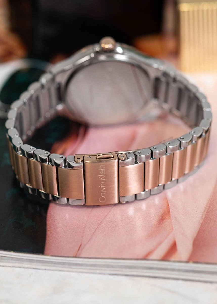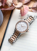 Рифленая заводная головка с защитой. Стальной браслет с частичным IP покрытием цвета розового золота. Раскладывающаяся застежка.