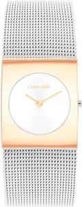 Гладкая заводная головка украшена логотипом ''CK''. Стальной браслет миланского плетения с регулируемой застежкой, украшенной логотипом бренда Calvin Klein.
